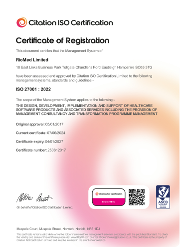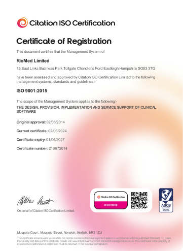 Security and quality are paramount at RioMed. We are Cyber Essentials Plus Certified, and we have accreditations such as ISO 9001 for quality management, ISO 14001 for environmental management, and ISO 27001 for information security management.
