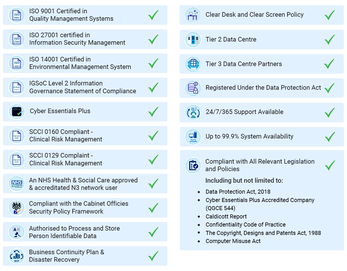We are compliant with the DSP Toolkit, HSCN, HSE, GDPR, and Risk Ledger Assessment requirements. Recently, we have been listed on national frameworks such as NHS England’s Health Systems Support Framework, NHS London’s Clinical Digital Solutions Framework, and Crown Commercial Service’s G-Cloud 13 Framework. These listed compliances and certifications help RioMed in every aspect, ensuring security and quality.