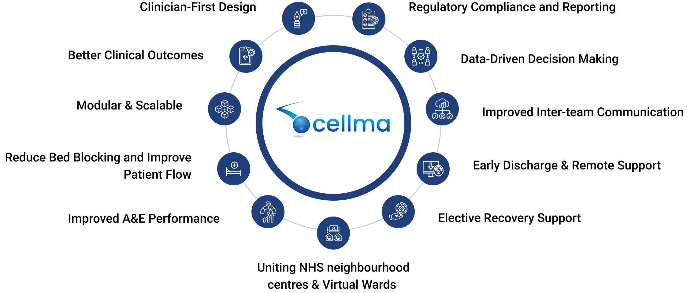 Cellma offers real-time alerts for 4-hour targets, predictive analytics to manage flow, and automated discharge planning. These functions reduce breaches, reduce bed scarcity, and enable reallocation of resources to electives, addressing all major NHS priorities.