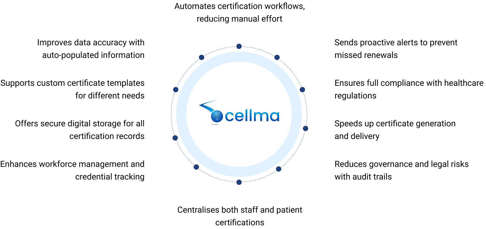 Cellma’s Medical Certification Solution provides exactly that, an integrated global platform for full Medical Certification Management, built seamlessly within the Cellma ecosystem. It will automate certification workflows, from renewals of staff licences, and competency tracking to patients’ assessments of fitness and disability. The Cellma medical certification solution enables automated alerts and real-time verification links. Above all, delivery is secure and digital, ensuring certifications are accurate, timely, and regulatory compliant with regional healthcare regulations. The Cellma solution enables hospitals, occupational health services and clinics to benefit safe operations with confidence.