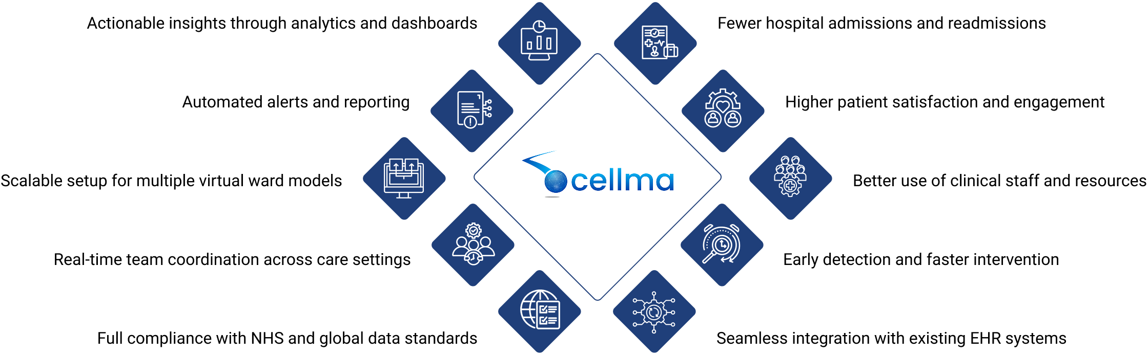 Yes. Cellma’s platform is designed to meet NHS and global guidelines for virtual wards and technology-enabled care. It supports data security, role-based access, audit-trails, and aligns with ICS and Trust governance frameworks.